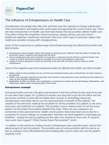 The Influence of Entrepreneurs on Health Care. (2022, Aug 27). Retrieved from https://hub.papersowl.com/examples/the-influence-of-entrepreneurs-on-health-care/