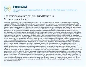 The Insidious Nature of Color Blind Racism in Contemporary Society. (2024, Jul 06). Retrieved from https://hub.papersowl.com/examples/the-insidious-nature-of-color-blind-racism-in-contemporary-society/