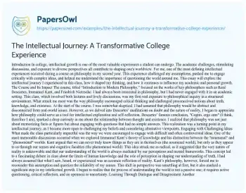 In college, intellectual growth is one of the most valuable experiences a student can undergo. The academic challenges, stimulating discussions, and exposure to diverse perspectives all contribute to shaping one's worldview. For me, one of the most defining intellectual experiences occurred during a course on philosophy in my second year. This experience challenged my assumptions, pushed me to engage critically with complex ideas, and helped me understand the importance of questioning the world around me. This essay will explore the intellectual journey I experienced in this class, how it shaped my thinking, and how it continues to influence my academic and personal growth.