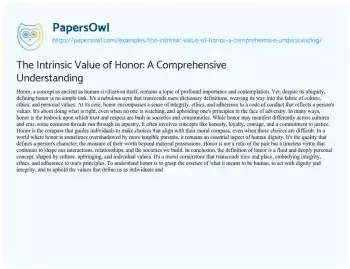 This essay delves into the multifaceted concept of honor, aiming to provide a comprehensive understanding of its intrinsic value. Titled “The Intrinsic Value of Honor: A Comprehensive Understanding,” the essay explores the essence of honor, emphasizing its role as a moral compass that guides individuals in upholding their principles, even in challenging circumstances. It highlights the universal qualities associated with honor, such as integrity, honesty, and courage, while acknowledging its cultural variations. Ultimately, the essay underscores the enduring significance of honor as a foundational aspect of human dignity and character, shaping our interactions, relationships, and the societies we construct. Additionally, PapersOwl presents more free essays samples linked to Value.