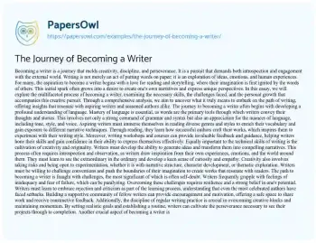 The Journey of Becoming a Writer. (2025, Mar 27). Retrieved from https://hub.papersowl.com/examples/the-journey-of-becoming-a-writer/