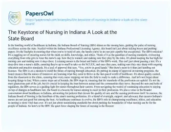 This essay about the Indiana Board of Nursing (IBN) sheds light on its pivotal role in maintaining and enhancing the quality of nursing within the state. It portrays the IBN as a crucial entity that not only licenses nurses but also ensures their continuous education and adherence to professional standards. The essay emphasizes the board’s functions in overseeing nursing education programs, ensuring that nurses meet the rigorous demands of healthcare, and disciplining those who falter. Beyond regulatory duties, the IBN is depicted as a supportive guide for nurses, offering resources for professional development and advocating for policies that improve healthcare quality. Through its comprehensive oversight and support, the IBN is presented as the cornerstone of nursing excellence in Indiana, playing a vital role in ensuring that healthcare recipients are in the most capable hands. On PapersOwl, there’s also a selection of free essay templates associated with Nursing.