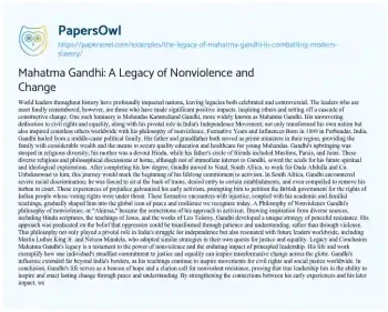Mahatma Gandhi: A Legacy of Nonviolence and Change. (2020, Dec 18). Retrieved from https://hub.papersowl.com/examples/the-legacy-of-mahatma-gandhi-in-combatting-modern-slavery/