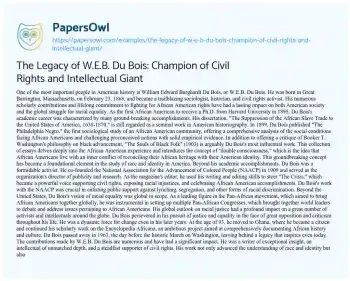 The Legacy of W.E.B. Du Bois: Champion of Civil Rights and Intellectual Giant. (2024, Jun 28). Retrieved from https://hub.papersowl.com/examples/the-legacy-of-w-e-b-du-bois-champion-of-civil-rights-and-intellectual-giant/