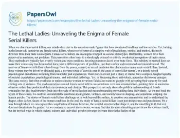 The Lethal Ladies: Unraveling the Enigma of Female Serial Killers. (2024, Jan 26). Retrieved from https://hub.papersowl.com/examples/the-lethal-ladies-unraveling-the-enigma-of-female-serial-killers/