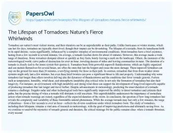 The Lifespan of Tornadoes: Nature's Fierce Whirlwinds. (2024, Feb 20). Retrieved from https://hub.papersowl.com/examples/the-lifespan-of-tornadoes-natures-fierce-whirlwinds/