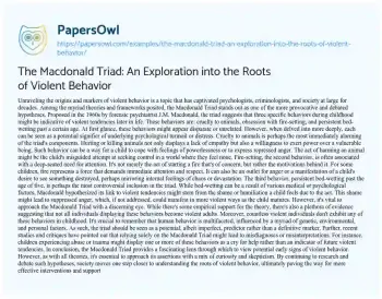 The Macdonald Triad: An Exploration into the Roots of Violent Behavior. (2023, Dec 04). Retrieved from https://hub.papersowl.com/examples/the-macdonald-triad-an-exploration-into-the-roots-of-violent-behavior/