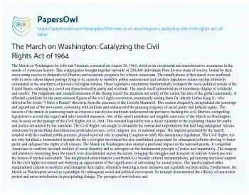 The March on Washington: Catalyzing the Civil Rights Act of 1964. (2024, May 28). Retrieved from https://hub.papersowl.com/examples/the-march-on-washington-catalyzing-the-civil-rights-act-of-1964/