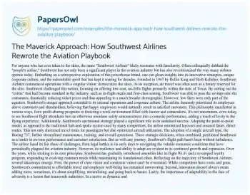 The Maverick Approach: How Southwest Airlines Rewrote the Aviation Playbook. (2023, Dec 04). Retrieved from https://hub.papersowl.com/examples/the-maverick-approach-how-southwest-airlines-rewrote-the-aviation-playbook/