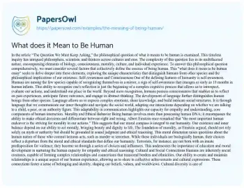 In the article “The Question We Must Keep Asking,” the philosophical question of what it means to be human is examined. This timeless inquiry has intrigued philosophers, scientists, and thinkers across cultures and eras. The complexity of this question lies in its multifaceted nature, encompassing elements of biology, consciousness, morality, culture, and individual experience. To answer this philosophical question comprehensively, we must consider several factors that collectively define the essence of being human. This "what does it mean to be human essay" seeks to delve deeper into these elements, exploring the unique characteristics that distinguish humans from other species and the philosophical implications of our existence.