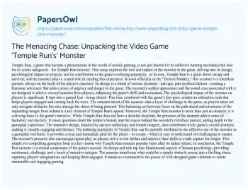 This essay delves into the intriguing world of the mobile game “Temple Run,” focusing specifically on its iconic antagonist, the Demon Monkey. It explores the monster’s design and its psychological impact on players, highlighting how it enhances the thrill and excitement of the game. The essay discusses how the monster taps into a primal fear of being chased, creating an adrenaline-fueled gaming experience that keeps players engaged. Additionally, it touches on the narrative role of the monster, contributing to the game’s mysterious and ancient temple setting, which adds depth and intrigue. The essay also examines how the monster’s presence in “Temple Run” serves as a core gameplay mechanic, driving the game’s popularity by offering a clear goal and a challenge that is both simple to understand and difficult to master. Overall, the essay presents the Temple Run monster as a key element in the game’s success, demonstrating how well-designed game components can create captivating and memorable gaming experiences. Additionally, PapersOwl presents more free essays samples linked to Video Game.