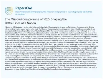 The Missouri Compromise of 1820: Shaping the Battle Lines of a Nation. (2024, Jul 06). Retrieved from https://hub.papersowl.com/examples/the-missouri-compromise-of-1820-shaping-the-battle-lines-of-a-nation/