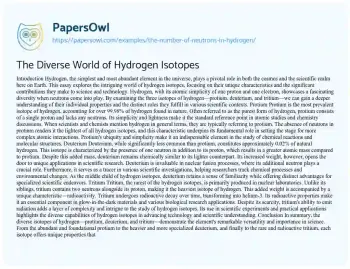 This essay is about the different isotopes of hydrogen and their neutron configurations. It explains that hydrogen has three isotopes: protium, with no neutrons, deuterium, with one neutron, and tritium, with two neutrons. Protium is the most common, while deuterium and tritium have significant scientific and industrial applications due to their unique properties. The essay highlights the importance of these isotopes in fields such as astrophysics, chemistry, and environmental science, where they play crucial roles in nuclear fusion, isotopic analysis, and tracing water sources. Overall, the essay underscores the significance of understanding hydrogen isotopes in various scientific contexts.