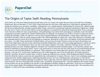The Origins of Taylor Swift: Reading, Pennsylvania. (2024, Jun 01). Retrieved from https://hub.papersowl.com/examples/the-origins-of-taylor-swift-reading-pennsylvania/