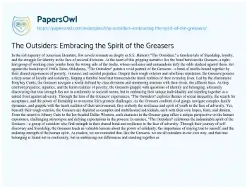 In this essay, the enduring spirit of the Greasers in S.E. Hinton’s “The Outsiders” is celebrated. Set against the backdrop of 1960s Tulsa, Oklahoma, the Greasers emerge as a tight-knit group of working-class youths bonded by loyalty, friendship, and resilience. Through their struggles against societal prejudice and class divisions, the Greasers exemplify the power of solidarity and individuality in the face of adversity. The essay explores themes of social inequality, identity, and the human spirit, reminding readers of the importance of embracing uniqueness and standing together in unity.