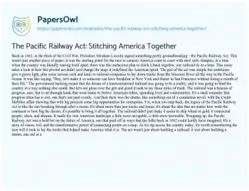 This essay about the Pacific Railway Act of 1862 discusses its transformative role in American history. Signed by Abraham Lincoln during the Civil War, the act authorized the construction of the transcontinental railroad, linking the country from coast to coast. It highlights the act’s ambition to unify the nation through infrastructure, despite the ongoing conflict. The essay acknowledges the challenges and consequences of the railroad’s construction, including the displacement of Native American tribes and instances of corruption like the Credit Mobilier scandal. Yet, it ultimately celebrates the act’s legacy in stitching the American landscape together, facilitating economic growth, and fostering a sense of national unity. By connecting distant communities and making travel and trade more efficient, the Pacific Railway Act didn’t just change the map; it redefined the American spirit and laid the groundwork for the country’s future expansion and prosperity. PapersOwl offers a variety of free essay examples on the topic of America.