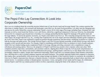 This essay about the ownership relationship between PepsiCo and Frito-Lay, two prominent players in the snack and beverage industry. It explores how PepsiCo’s acquisition of Frito-Lay in 1965 has shaped their strategic partnership, leading to synergies in distribution, innovation, and corporate culture. Despite being owned by PepsiCo, Frito-Lay maintains its distinct brand identity and product lines. The summary highlights how this collaboration enables both companies to cater to diverse consumer preferences while staying ahead in a competitive market. Ultimately, the essay emphasizes the significance of this partnership in driving growth and innovation in the global snack and beverage industry.