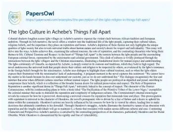 Colonial shadows lengthen across Igbo villages as Achebe's narrative exposes the violent clash between African tradition and European ambition. Through its rich narrative, the novel offers a window into the traditional life of the Igbo people, capturing their cultural values, religious beliefs, and the importance they place on reputation and honor. Achebe's depiction of these themes not only highlights the unique qualities of Igbo society but also reveals universal truths about human nature and society's desire for respect and individuality. This essay will delve into the ways Achebe achieves this, examining the cultural tensions, the role of reputation, and the contrasting characters who bring these themes to life.