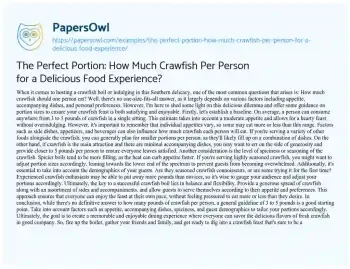 This essay about determining the ideal portion of crawfish per person for a satisfying dining experience. It discusses factors such as appetite, accompanying dishes, spiciness, and guest demographics that influence portion sizes. While there’s no fixed amount, a general guideline of 3 to 5 pounds per person is suggested. The essay emphasizes the importance of balance, flexibility, and tailoring portions to ensure all guests can enjoy the feast according to their preferences. Ultimately, it aims to help hosts create a memorable crawfish boil where everyone leaves satisfied after indulging in this beloved Southern delicacy. On PapersOwl, there’s also a selection of free essay templates associated with Food.