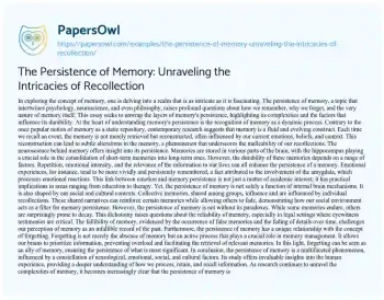 This essay delves into the intricate and multifaceted concept of the persistence of memory, exploring it from the perspectives of psychology, neuroscience, and even philosophy. It challenges the traditional view of memory as a static repository, proposing instead that memory is a dynamic, evolving process influenced by various factors. The essay discusses how memories are reconstructed during recall, influenced by emotions, beliefs, and context, highlighting the brain’s role, particularly the hippocampus and amygdala, in memory consolidation and emotional intensity. It also examines the impact of social and cultural contexts on memory, emphasizing the interplay between individual and collective memories. The essay addresses the paradoxes of memory persistence, including the fallibility of memory and the phenomenon of forgetting, presenting it not as a failure but as an active process that aids memory management. By exploring these dimensions, the essay offers a comprehensive understanding of how memories are formed, maintained, and sometimes altered, underscoring the complexities that define human recollection and perception. At PapersOwl too, you can discover numerous free essay illustrations related to Memory.