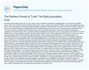 The Perilous Pursuit of Truth: The Risks Journalists Face. (2021, Oct 15). Retrieved from https://hub.papersowl.com/examples/the-philippine-government-protects-journalists/