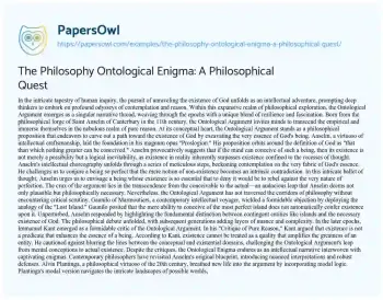 The Ontological Argument, originating from Saint Anselm of Canterbury in the 11th century, is a philosophical endeavor seeking to establish the existence of God based solely on the concept of God. Anselm’s proposition revolves around the definition of God as “that than which nothing greater can be conceived.” The argument contends that if one can conceive of such a supremely perfect being, then its existence must be necessary, as existence in reality is greater than existence confined to the realm of thought. While critics like Gaunilo and Immanuel Kant have raised objections, the Ontological Argument remains a fascinating exploration into the interplay between conceivability and existence, challenging thinkers to navigate the delicate balance between pure reason and empirical reality. Contemporary philosophers, including Alvin Plantinga, have contributed nuanced interpretations, ensuring that the Ontological Argument continues to be a captivating subject of philosophical inquiry. Moreover, at PapersOwl, there are additional free essay samples connected to Philosophy.