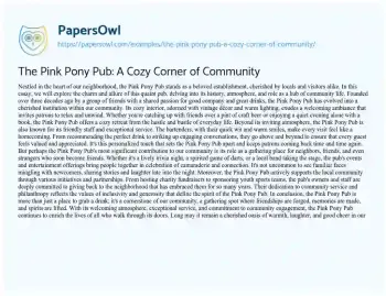 This essay about the Pink Pony Pub celebrates the cherished establishment’s role as a beloved community hub. It highlights the pub’s inviting atmosphere, friendly staff, and dedication to fostering connections among patrons. From its cozy interior to its engaging events and community initiatives, the Pink Pony Pub provides a welcoming space where neighbors and friends gather to relax, socialize, and create lasting memories. Through its commitment to hospitality and community engagement, the pub has become an integral part of the neighborhood, embodying the values of camaraderie, inclusivity, and generosity. More free essay examples are accessible at PapersOwl about Community.