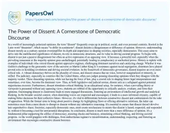 The Power of Dissent: A Cornerstone of Democratic Discourse. (2023, Oct 10). Retrieved from https://hub.papersowl.com/examples/the-power-of-dissent-a-cornerstone-of-democratic-discourse/