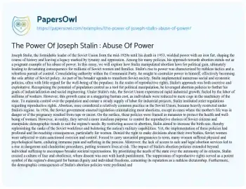 This essay about Joseph Stalin’s abuse of power examines how he manipulated abortion laws for political gain, leading to devastating consequences for Soviet women and families. By restricting reproductive rights, Stalin aimed to control the population and bolster industrial growth, resulting in coercion, suffering, and societal upheaval. The essay underscores the profound impact of Stalin’s policies on individual autonomy and the broader fabric of Soviet society, highlighting the enduring legacy of his oppressive regime and the importance of defending fundamental human rights.