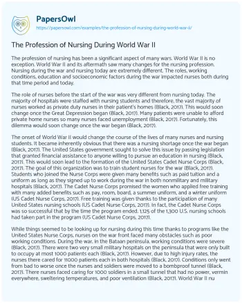 The Profession of Nursing During World War II. (2020, May 06). Retrieved from https://hub.papersowl.com/examples/the-profession-of-nursing-during-world-war-ii/