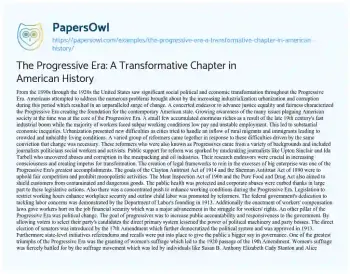 This essay is about the Progressive Era a significant period in American history from the 1890s to the 1920s characterized by extensive social political and economic reforms. It highlights the efforts of reformers to address issues such as economic inequality poor working conditions urbanization challenges and political corruption. Key achievements include the establishment of regulatory frameworks to control big business improvements in labor conditions political reforms to increase government accountability and the successful women’s suffrage movement. Additionally the essay touches on social reforms such as the creation of settlement houses and public education improvements and the early conservation efforts to protect natural resources. The Progressive Era’s legacy is seen in the continued impact of these reforms on modern American society.