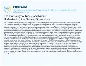 This essay about the diathesis-stress model, a framework in psychology that explores how genetic predispositions interact with environmental stressors to influence mental health. Through real-life examples like depression and schizophrenia, it illustrates how individuals with certain genetic vulnerabilities may be more prone to developing psychological disorders when faced with significant life stressors. The essay emphasizes the dynamic interplay between nature and nurture, highlighting the importance of recognizing individual differences and crafting targeted interventions. Ultimately, it underscores the need for a deeper understanding of these complex interactions to promote psychological well-being and resilience. Additionally, PapersOwl presents more free essays samples linked to Psychology.