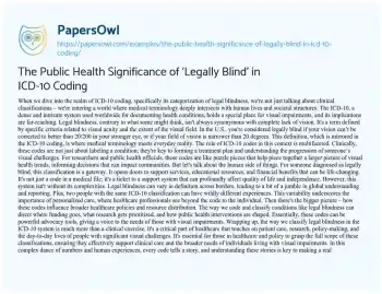 This essay delves into the multifaceted significance of the term ‘legally blind’ within the ICD-10 coding system, illuminating its impact on individuals, healthcare practices, and public health policy. It begins by clarifying the criteria that define legal blindness, highlighting the nuances beyond complete vision loss. The essay emphasizes the role of ICD-10 codes in clinical scenarios, from guiding treatment plans to monitoring the progression of visual impairments. Beyond clinical implications, it explores the personal and legal consequences for individuals classified as legally blind, particularly in terms of accessing crucial support and services. The essay also tackles the challenges and inconsistencies in global coding practices, stressing the importance of personalized healthcare approaches. Moreover, it discusses how accurate coding influences public health decisions, from allocating resources to prioritizing research and interventions. This insightful exploration sheds light on the profound intersection of medical coding, personal experiences, and societal structures, underscoring the need for a deeper understanding and more effective use of these classifications in public health and individual care. At PapersOwl, you’ll also come across free essay samples that pertain to Public Health.