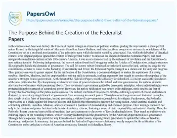 The Purpose Behind the Creation of the Federalist Papers. (2024, May 21). Retrieved from https://hub.papersowl.com/examples/the-purpose-behind-the-creation-of-the-federalist-papers/