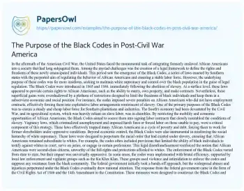 Order now However, the underlying purpose of these codes was far more insidious, seeking to maintain white supremacy and control over the black population in the guise of legal regulation.