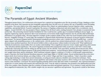 This essay will provide an overview of the pyramids of Egypt, focusing on their historical significance, construction methods, and cultural importance. It will explore the architectural ingenuity behind these ancient wonders, discussing theories on how they were built and their purpose. The piece will also delve into the role of the pyramids in Egyptian religion and society, including their function as tombs for pharaohs. Additionally, it will touch on recent archaeological discoveries and ongoing research related to the pyramids. Also at PapersOwl you can find more free essay examples related to Ancient Egypt.