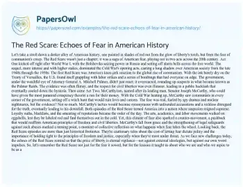 This essay about the Red Scare dives into America’s historical fear of communism, which manifested in two major waves during the 20th century. The first wave, following World War I, saw the U.S. government’s aggressive response to the perceived communist threat, leading to widespread violations of civil liberties through actions like the Palmer Raids. The second wave, known as McCarthyism in the 1950s, was characterized by Senator Joseph McCarthy’s baseless accusations of communist infiltration within the U.S. government, resulting in a national witch hunt. Both periods were marked by a climate of fear and suspicion, affecting the arts, academia, and labor movements, and leading to blacklists and loyalty oaths. The essay highlights how these episodes not only stifled dissent and encouraged conformity but also eventually spurred a reevaluation of American values, particularly the balance between security and civil liberties. It concludes by reflecting on the Red Scare’s legacy as a cautionary tale about the dangers of fear-driven politics and the importance of protecting freedoms. PapersOwl offers a variety of free essay examples on the topic of American History.