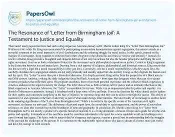The Resonance of 'Letter from Birmingham Jail': A Testament to Justice and Equality. (2023, Oct 16). Retrieved from https://hub.papersowl.com/examples/the-resonance-of-letter-from-birmingham-jail-a-testament-to-justice-and-equality/