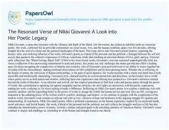 The Resonant Verse of Nikki Giovanni: A Look into Her Poetic Legacy. (2024, Mar 25). Retrieved from https://hub.papersowl.com/examples/the-resonant-verse-of-nikki-giovanni-a-look-into-her-poetic-legacy/