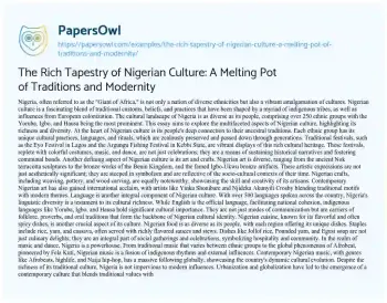 The Rich Tapestry of Nigerian Culture: A Melting Pot of Traditions and Modernity. (2023, Nov 24). Retrieved from https://hub.papersowl.com/examples/the-rich-tapestry-of-nigerian-culture-a-melting-pot-of-traditions-and-modernity/