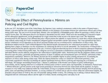 This essay about Pennsylvania v. Mimms discusses the landmark 1977 Supreme Court decision and its profound impact on law enforcement practices and civil rights in the United States. It outlines the case’s background, where Harry Mimms was stopped for a traffic violation, and the subsequent legal battle that culminated in the Supreme Court ruling in favor of allowing police to ask drivers to exit their vehicles during traffic stops. The decision is analyzed for its emphasis on officer safety over a minor intrusion on personal liberty. The essay explores the broader implications of this ruling, including its role in ongoing debates over police discretion, potential for abuse of power, and the balance between public safety and individual rights. It highlights how Mimms has influenced police protocols and the broader discourse on police reform and accountability, emphasizing the challenge of ensuring justice and safety for all parties involved.