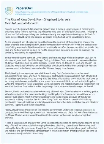 The Rise of King David: From Shepherd to Israel's Most Influential Monarch. (2023, Mar 31). Retrieved from https://hub.papersowl.com/examples/the-rise-of-king-david-from-shepherd-to-israels-most-influential-monarch/