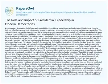 The Role and Impact of Presidential Leadership in Modern Democracies. (2024, May 21). Retrieved from https://hub.papersowl.com/examples/the-role-and-impact-of-presidential-leadership-in-modern-democracies/