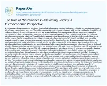 The Role of Microfinance in Alleviating Poverty: A Microeconomic Perspective. (2024, Mar 02). Retrieved from https://hub.papersowl.com/examples/the-role-of-microfinance-in-alleviating-poverty-a-microeconomic-perspective/