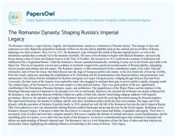 The Romanov Dynasty: Shaping Russia's Imperial Legacy. (2024, Feb 20). Retrieved from https://hub.papersowl.com/examples/the-romanov-dynasty-shaping-russias-imperial-legacy/