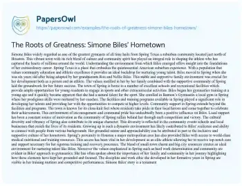 The Roots of Greatness: Simone Biles’ Hometown. (2024, Jul 06). Retrieved from https://hub.papersowl.com/examples/the-roots-of-greatness-simone-biles-hometown/