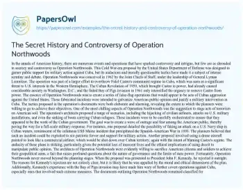 This essay about Operation Northwoods explores the controversial Cold War-era plan proposed by the U.S. Department of Defense to justify military action against Cuba through staged false-flag operations. It examines the ethical implications, the reasons for its rejection by President Kennedy, and the broader questions it raises about governance, state power, and democratic principles.