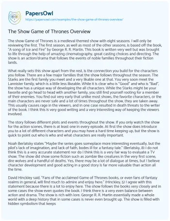 The Show Game of Thrones Overview. (2021, Mar 26). Retrieved from https://hub.papersowl.com/examples/the-show-game-of-thrones-overview/
