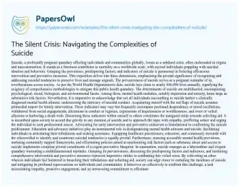 The Silent Crisis: Navigating the Complexities of Suicide. (2024, Mar 01). Retrieved from https://hub.papersowl.com/examples/the-silent-crisis-navigating-the-complexities-of-suicide/