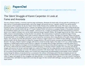 The Silent Struggle of Karen Carpenter: A Look at Fame and Anorexia. (2024, Feb 20). Retrieved from https://hub.papersowl.com/examples/the-silent-struggle-of-karen-carpenter-a-look-at-fame-and-anorexia/